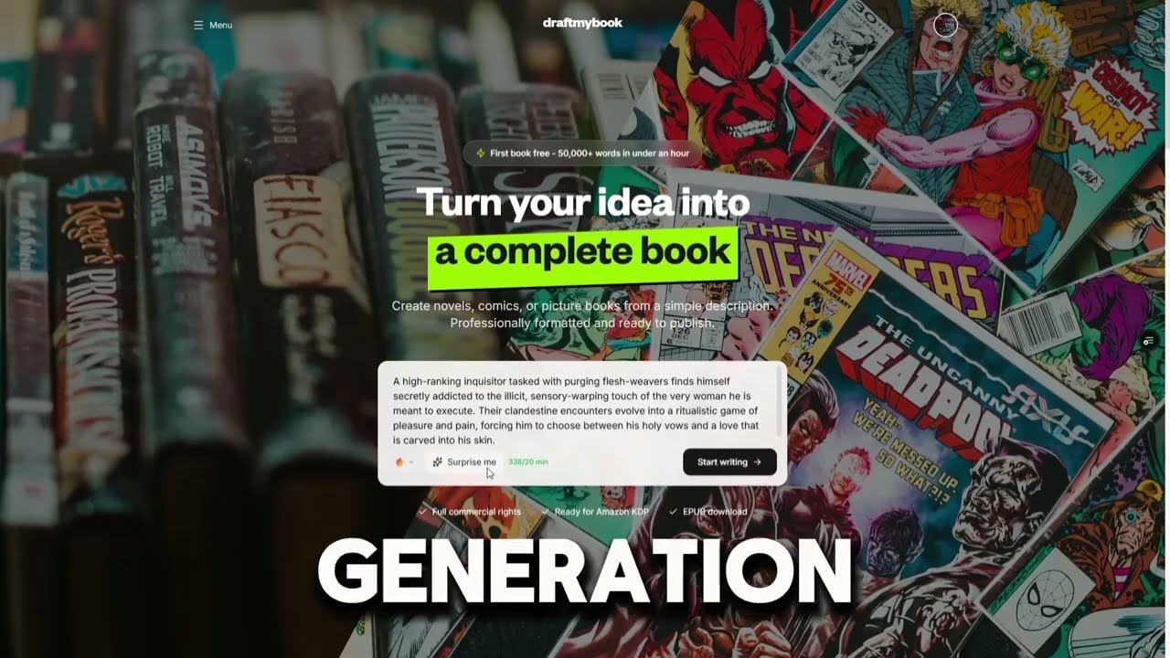 Download your completed book with an AI-generated cover. Novels come as EPUB files; comic books and picture books come as PDF files. All formats are ready for Amazon KDP.